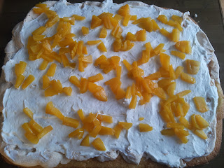 Levitin pohjalle kermavaahto+rahkaseoksen ja päälle persikkapaloja